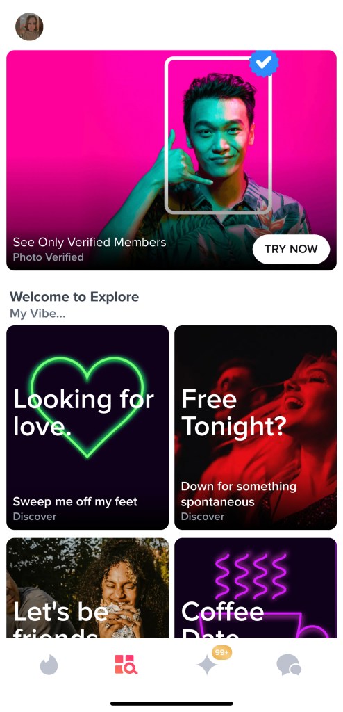 - Format: Tinder has 4 tabs. Tab 1 is where you can browse through potential matches. Tab 2 is the explore page, where you can check out the different ways you can browse for matches for free. Categories like only verified people, people looking for love, people who are free tonight, friends, coffee dates, and much more! Tab 3 is where, if you have Tinder Gold or platinum you can see who liked you. Here you can also view your top picks. If you don’t have a subscription, you’ll only be able to swipe right or super like the ones you want, but you can’t swipe left. The last tab is for chatting with your matches.